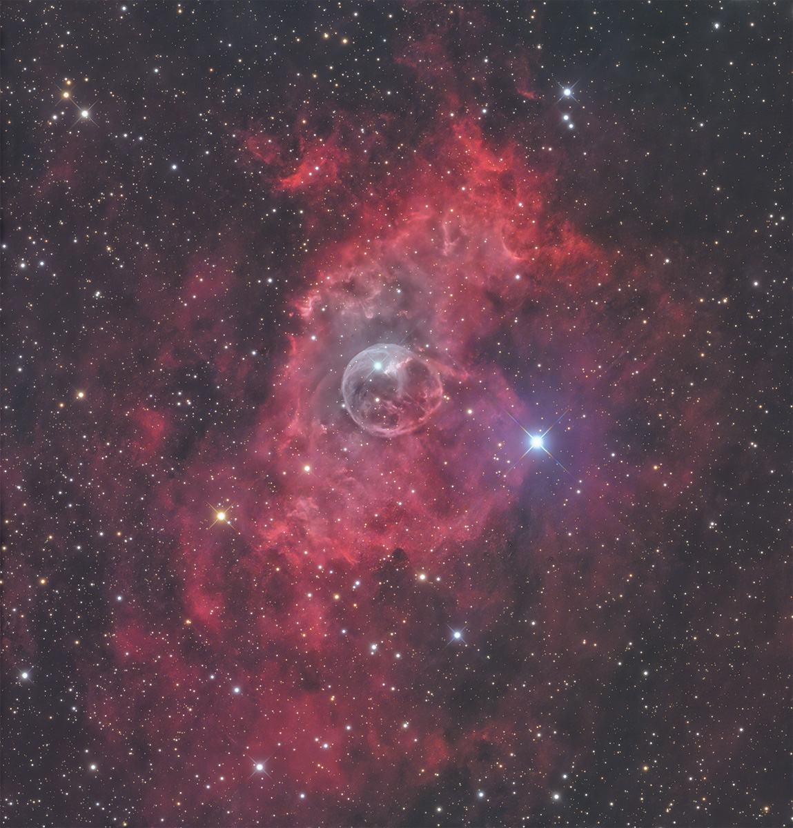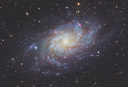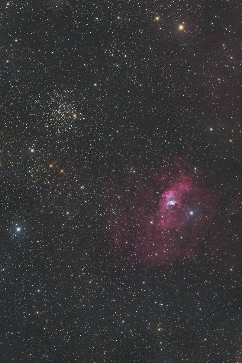この2つの作品、私にしてはストレッチの加減が弱いです。最近1300㎜で撮影するようになって、画面全体を使わずに一部分だけを切り出すという作り方もあるのかなと思い、M33は中心部、しゃぼん玉星雲はM52を捨ててしゃぼん玉だけで作ってみようと考えたのです。