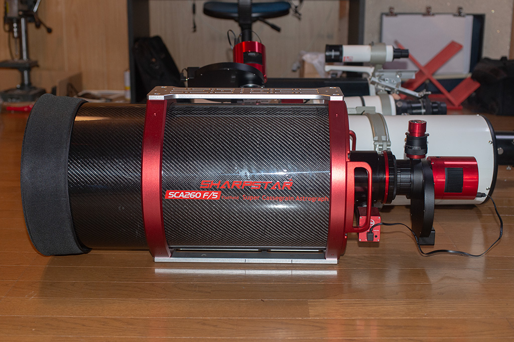 | 2025/11/11 前回の記事が2024年の9月なので、1年ちょっとでの更新になります。 ブログでは、経過を書いていますが、一応撮影ノートに総括みたいな感じでまとめて置こうと思います。昨年秋以降、人生最後の鏡筒をどうするか、色々迷っていましたが、結局年末に決断したのはSharpStar SCA260v2となりました。15Kg持てなくなったら終了という道を選んだという事です。 とりあえず1年使った感じでは、これでよかったと言えます。 1,意外と簡単に持てるので、AM5赤道儀への搭載も簡単です。 2,ネットの動画に、この鏡筒ではAM5はちょっと非力というような記事もありましたが、1年間使ってトラブルはありません。 3,光軸調整が非常に容易で、一度合わせると殆どズレないので使いやすいです。 4,バックフォーカスが十分あり、イメージサークルも広いので、オフアキシスガイドが組み込みやすい点も良いですね。 5,ミラー後方にFANが3個付いているので、夏場でも筒内温度の順応が速い。 6,肝心の星像はフルサイズでも周辺までかなり綺麗に点像となり、BXTを併用すれば星像に関しては全く問題を感じません。 7,作例はまだ少ないですが、F5はそこそこ明るいです。 8,1300㎜の焦点距離で暗い(淡い)対象を狙う事はこれまで出来なかったので、対象選びが楽しいです。 結露対策には爬虫類飼育用のヒーター1mと自作フードを使っています。結露が多い日でも問題なく撮影出来ています。主鏡まで結露したのは1回だけです。現在2025年11月ですが、新潟では年内の運用はこれで終わりかもしれません。1年間で、テスト撮影も入れれば30回近く設営して、20対象撮影し、19対象をデジタルマジックに載せる事が出来たので、そこそこ活用出来たと思います。鏡筒やフィルタ―のクセも大体分かったので、気合を入れて作品作りをするのが来年の目標となるでしょう。 昨年まで斜鏡の修理も無事に終わって大活躍していたR200SSはしばらく出番が無さそうです。以前は2台体制で撮影したりしていましたが、SCA2600に慣れるまでは1台に集中した方が良さそうです。年もとったしね。 |